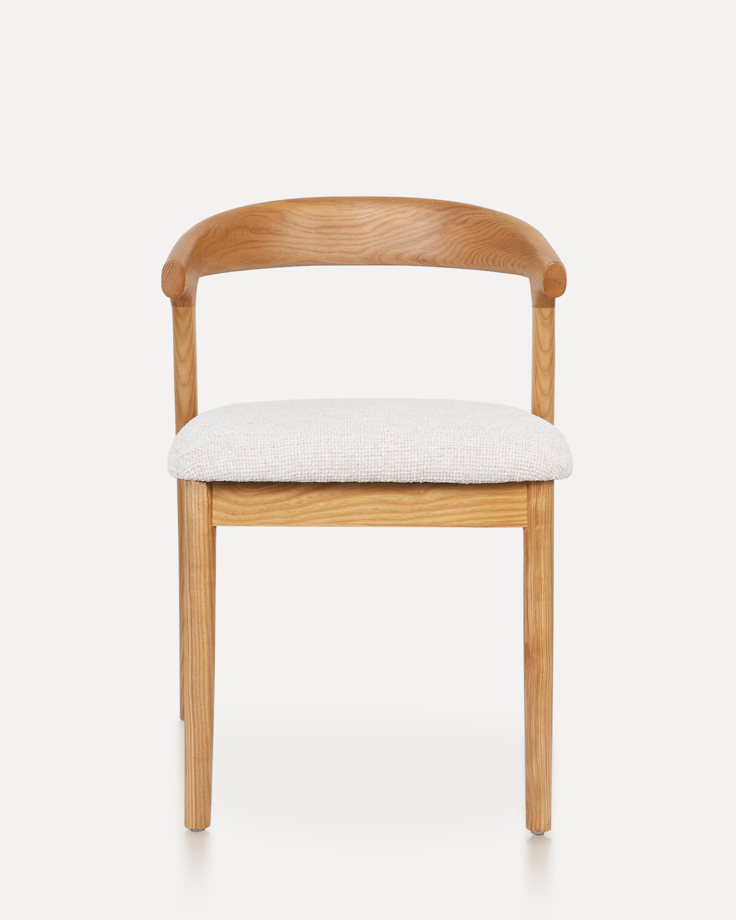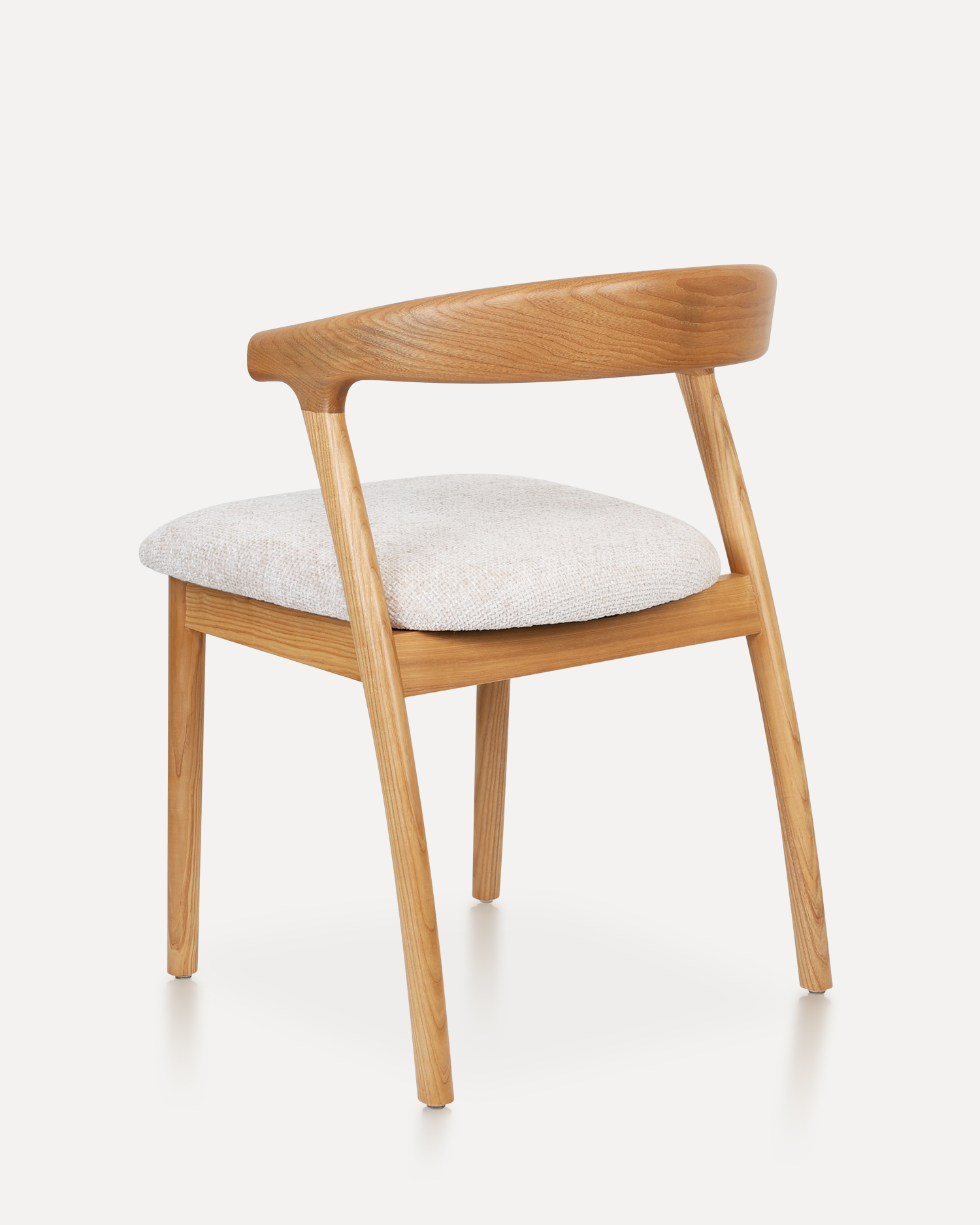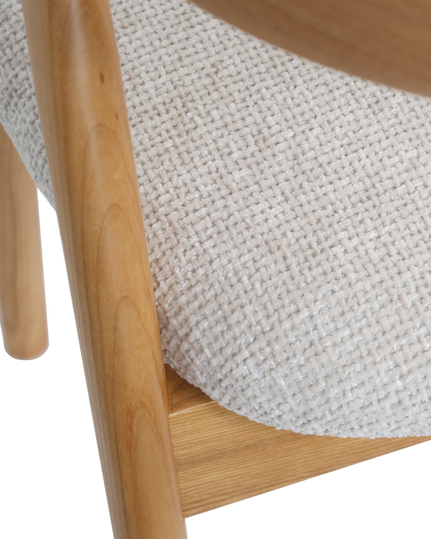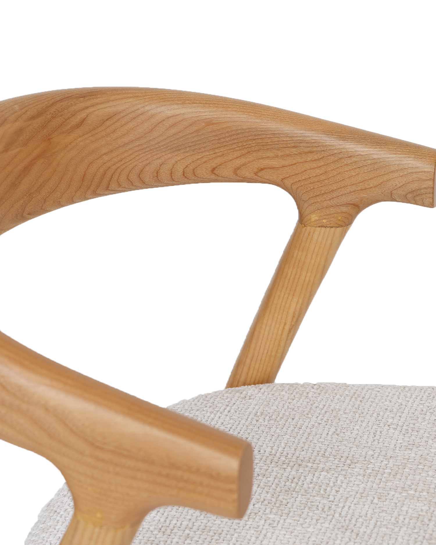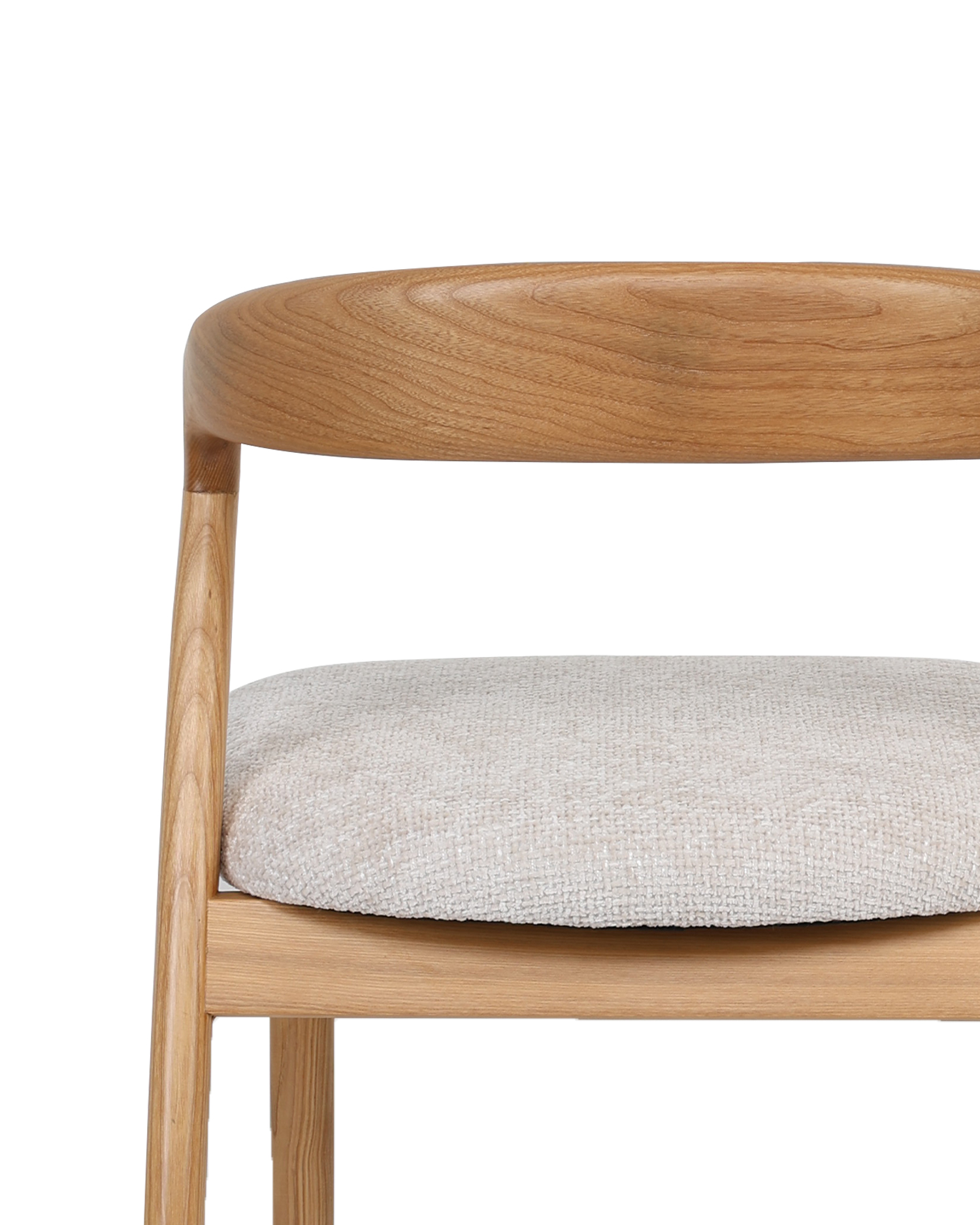 • A well-padded seat upholstered in a neutral fabric offers comfort without overwhelming the chair's elegant form. The gently rounded backrest supports your posture, inviting you to linger at the table long after meals are over.
