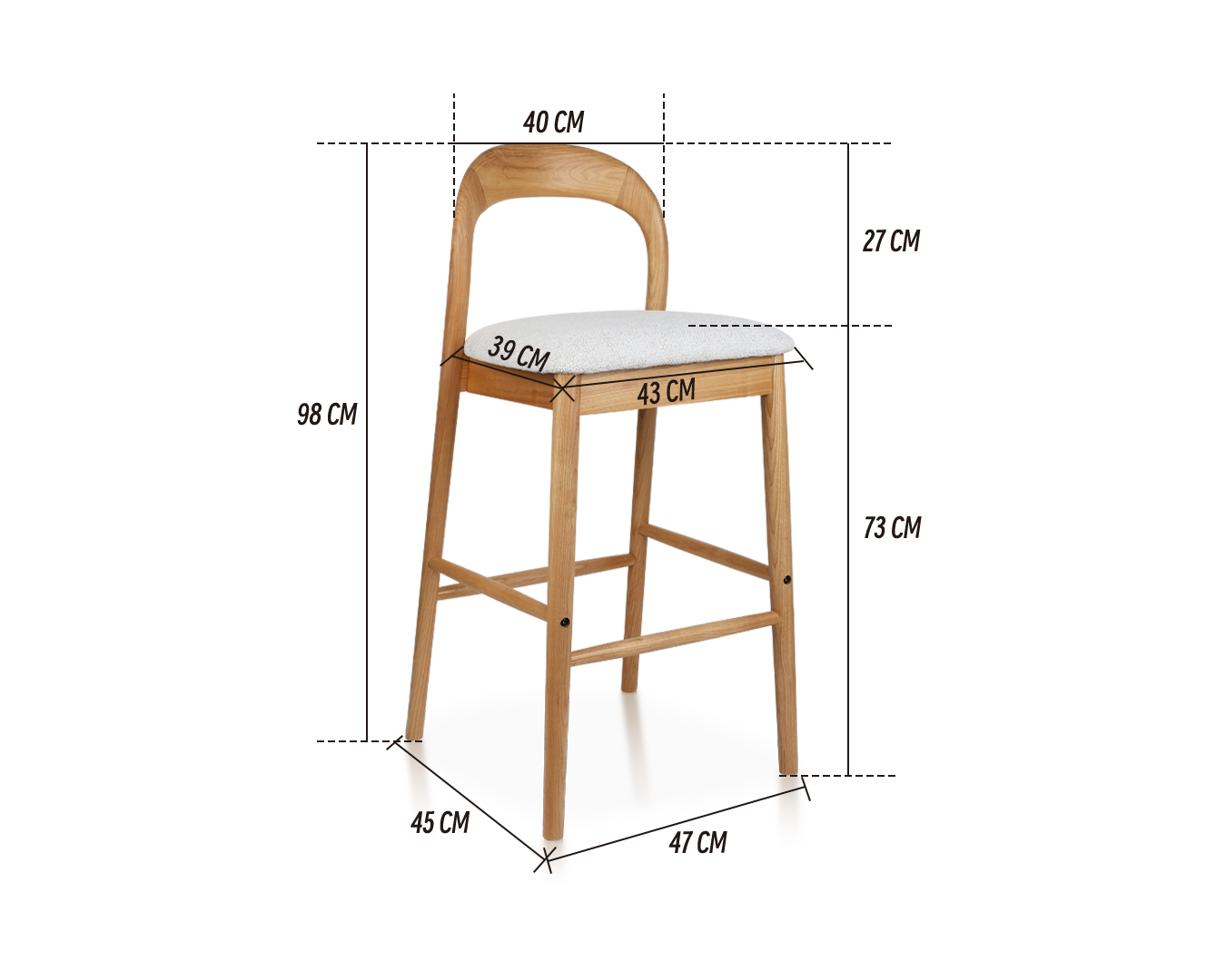• A softly cushioned seat enhances comfort, making it ideal for long conversations or casual meals. The built-in footrests provide extra support, while the slim legs maintain an airy, modern profile—perfect for kitchens, cafés, or home bars.